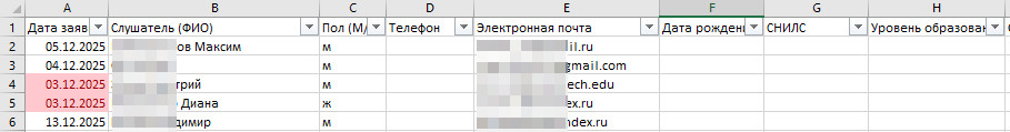 Файл загрузки слушателей ДО в 1С:УУЦ (фрагмент).