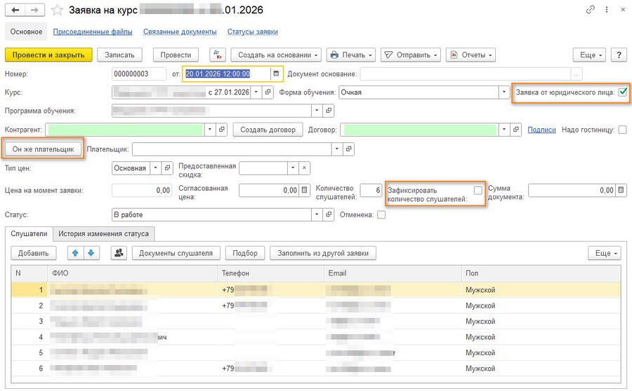 - После установки флага в форме появятся поля: «Контрагент», «Плательщик», «Договор», а вместо одного слушателя — табличная часть для ввода нескольких слушателей.