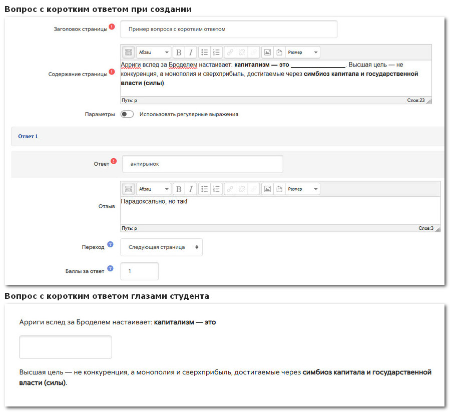 Студент должен ответить одним словом или короткой фразой. Преподаватель должен предвидеть возможные ответы и ввести их в поле для ответов, используя при необходимости символы **. В поле для ответов доступен только обычный текстовый редактор.